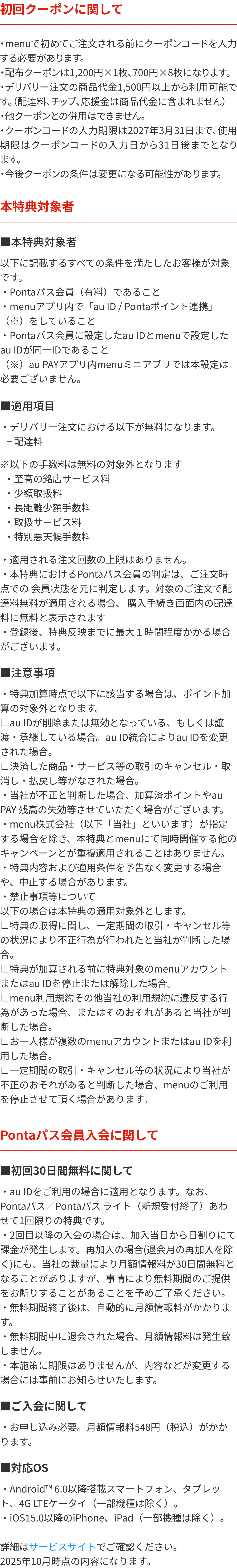 初月無料!さらに Pontaパス会員(有料)なら おトクな特典がたくさん!menuのデリバリーが何度でも配達料無料 ※一部手数料は対象外となります 会員限定キャンペーン その1!menuのデリバリーでローソンがおトク! ローソン商品のご注文に使える! 700円分クーポン×2 が毎週もらえる!会員限定キャンペーン その2!クーポンフィーバー 対象の人気店のクーポンが毎週もらえる!他にもPontaパス会員限定のクーポンも続々と配布中!さらにmenuならPontaポイントがたまる!つかえる!詳しくはアプリ内をチェック